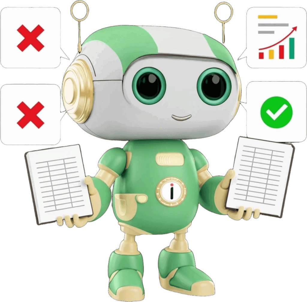 Reconcile mismatched asset data, transaction logs, or vendor costs in seconds — without needing to open a spreadsheet. Finn finds what’s missing or off, and shows you why.