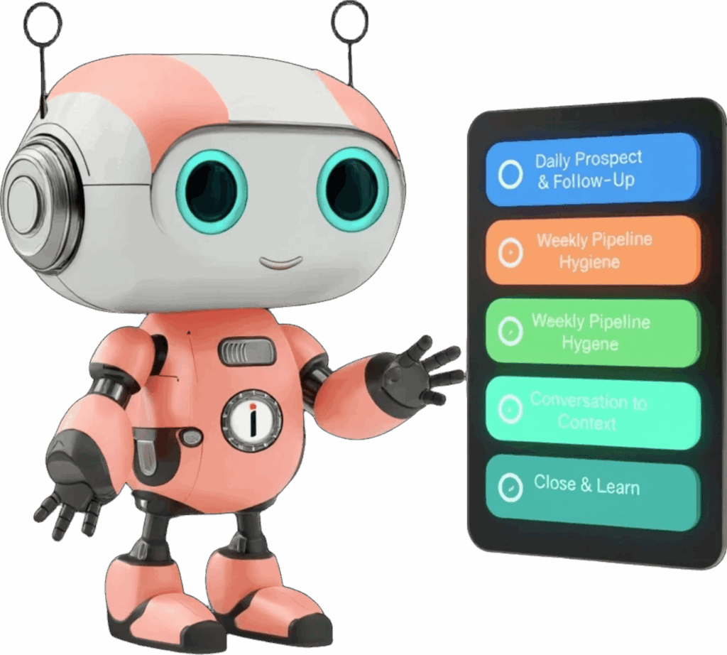 Review stages → Update deal notes → Nudge owners on stuck opps → Refresh next-step tasks